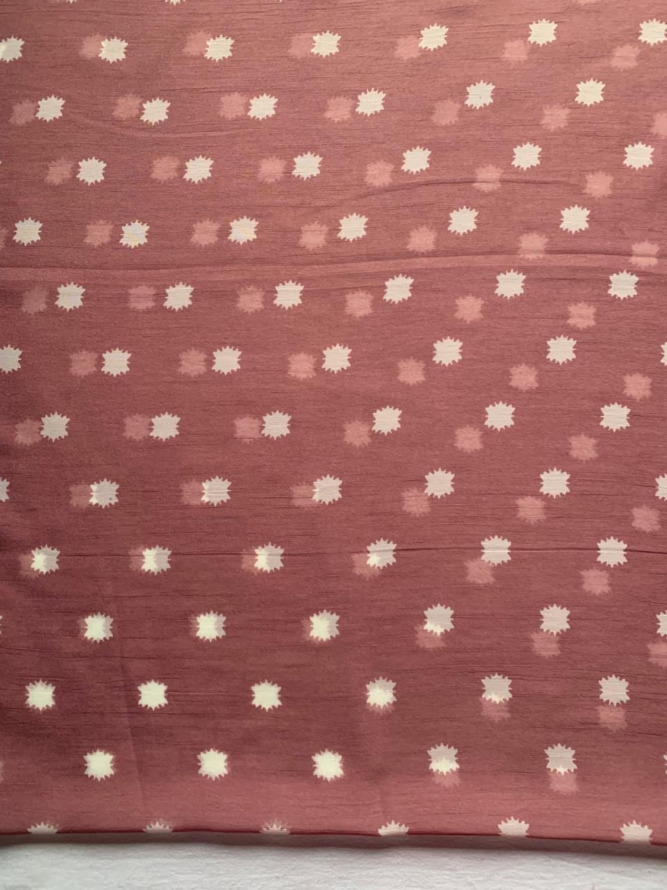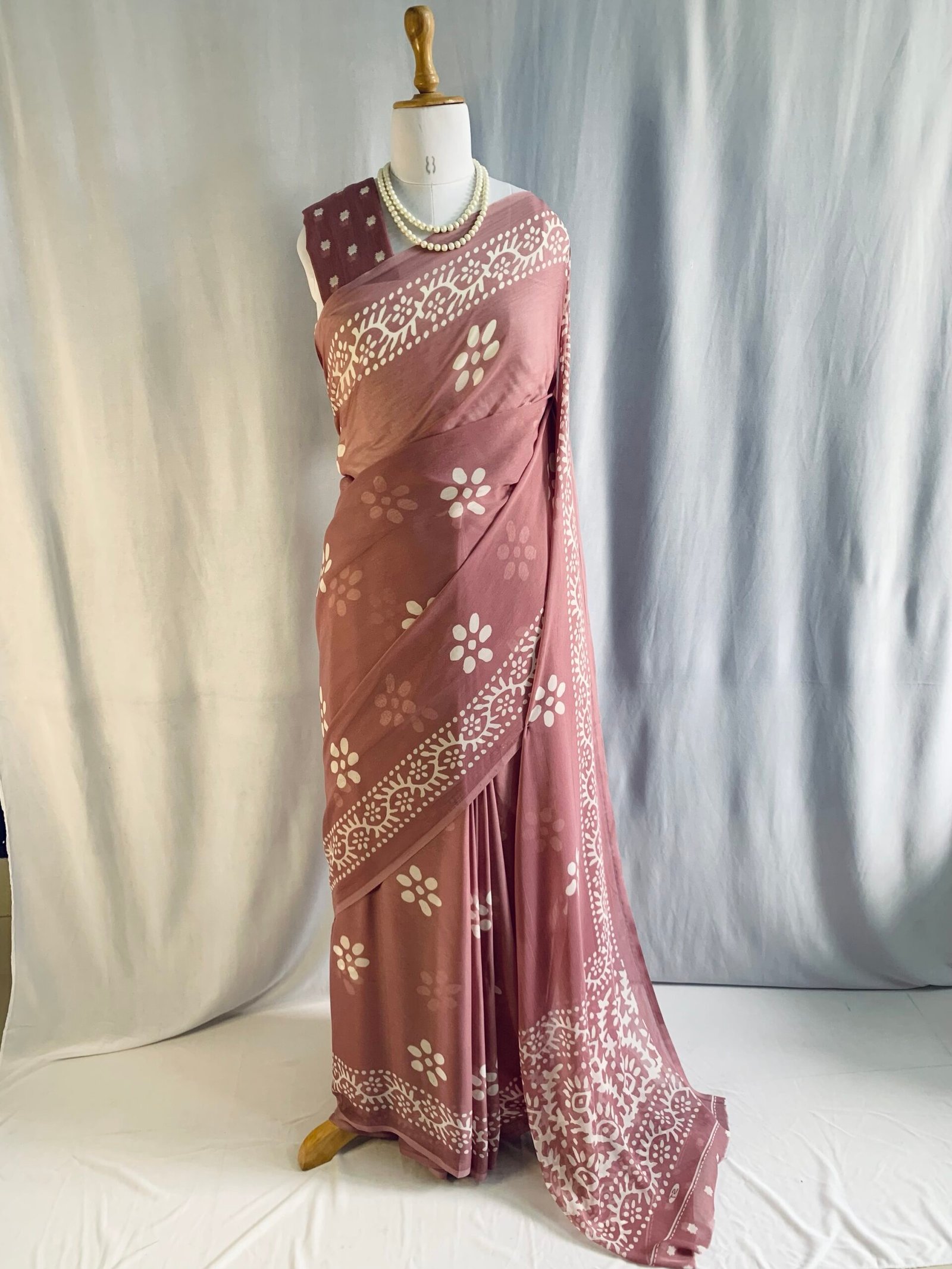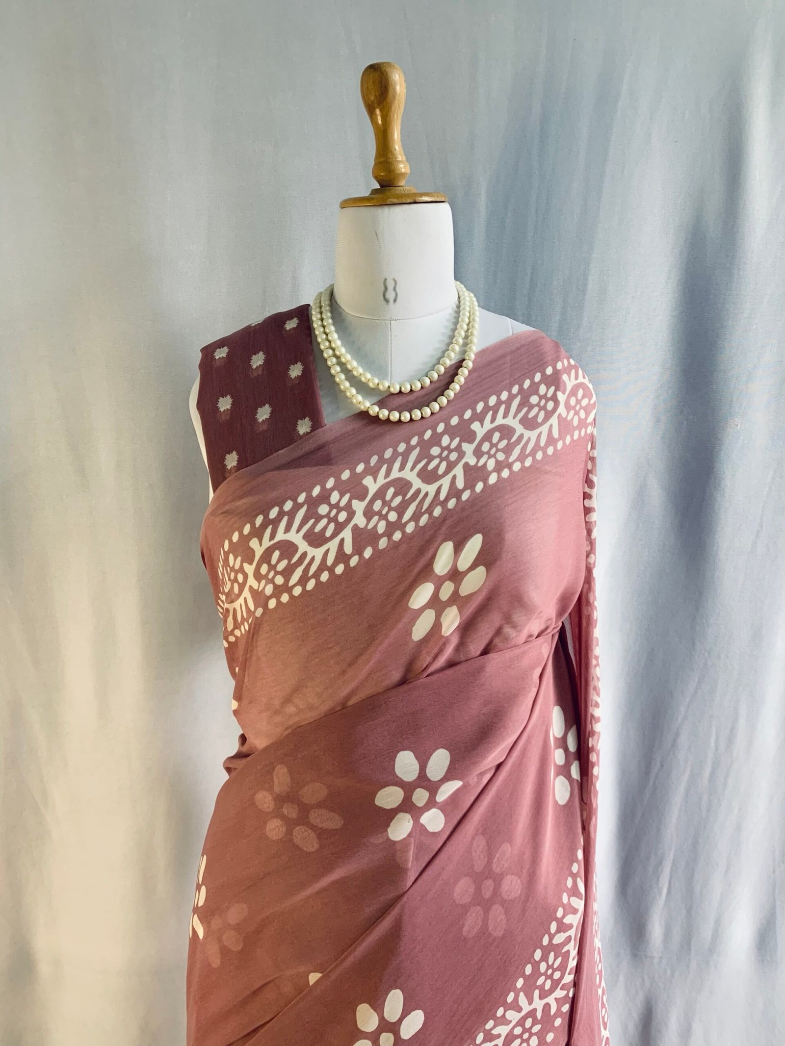 Dusty Rose Chiffon Saree with White Floral and Geometric patterns.