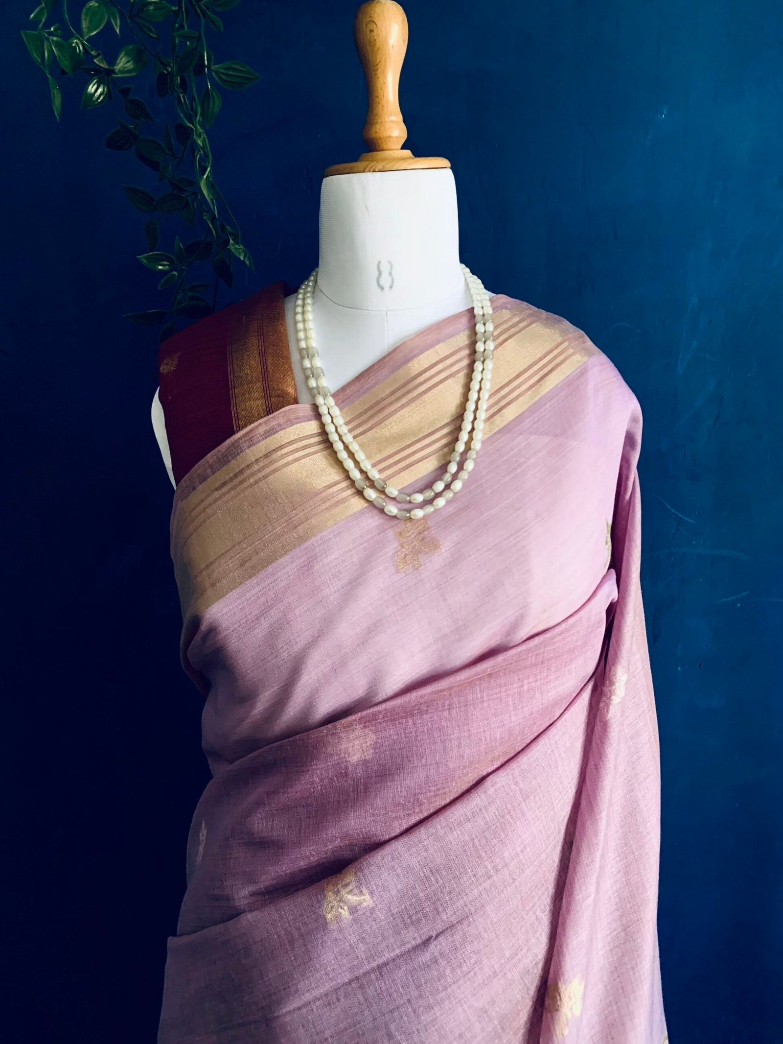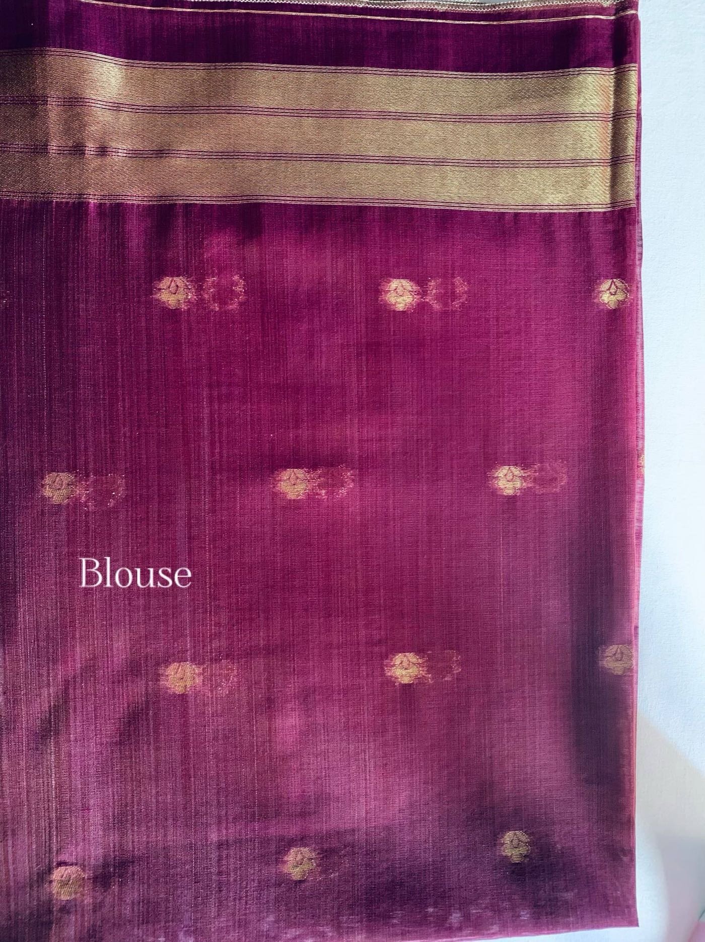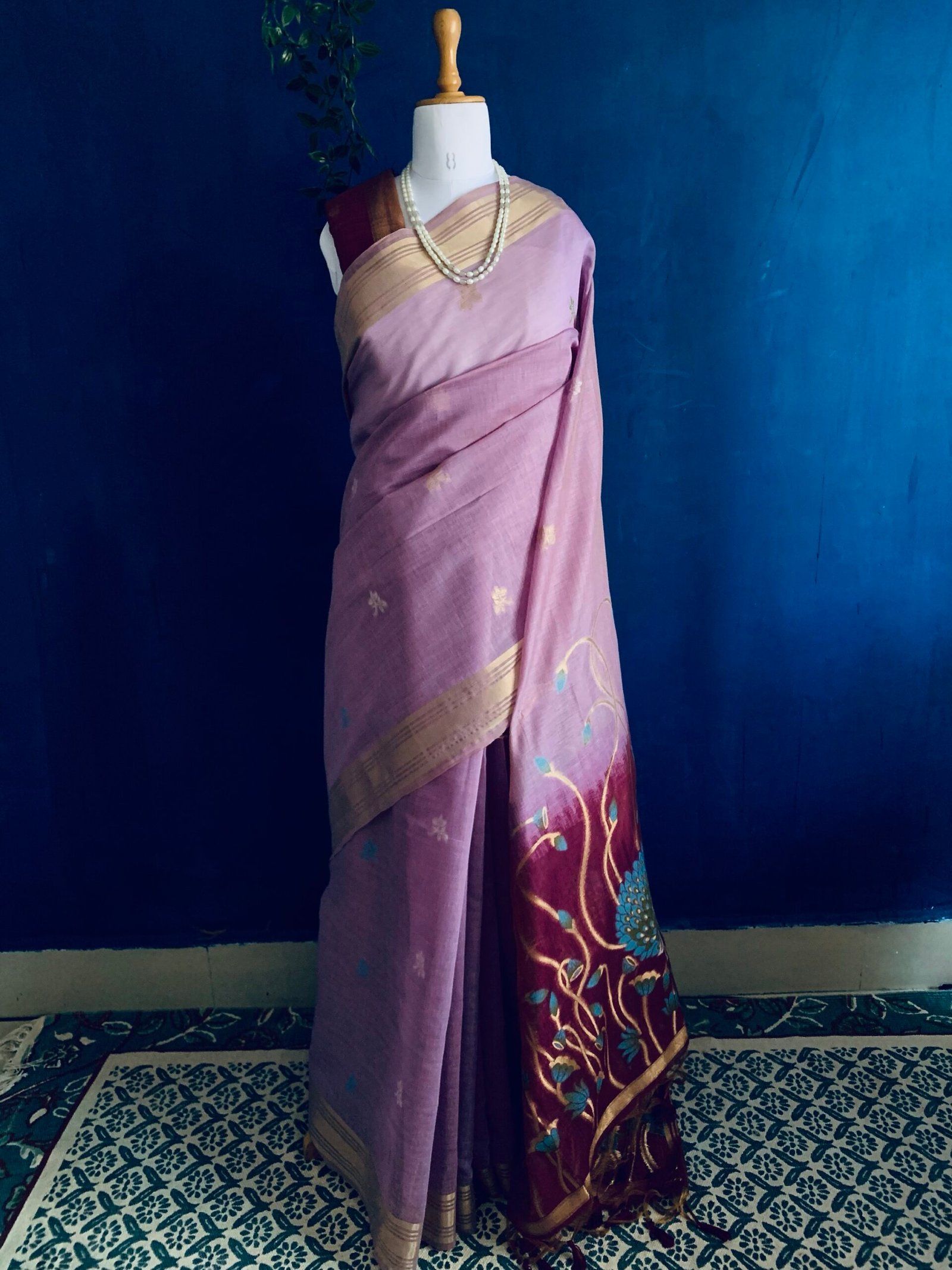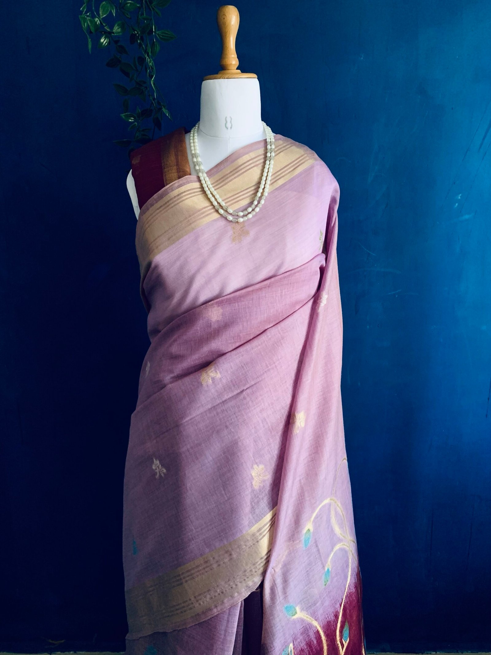 Ombré Lilac Zari Woven Premium Muga Silk Saree with beautiful Floral Designs.